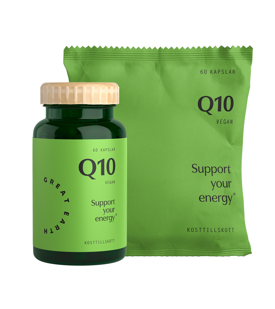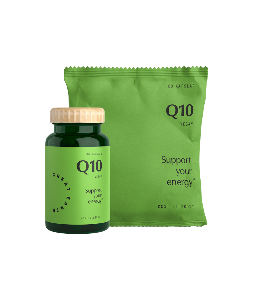 Smart Starter pack med burk och en refill att fylla på med. Coenzyme Q10 är ett vitaminliknande ämne som finns naturligt i vår kropp, men förmågan att producera Q10 avtar med stigande ålder. Q10 har en viktig roll i energiproduktionen i mitokondrierna inuti kroppens celler.- Förbrukning: 1 tablett om dagen. Packet räcker 120 dagar (4 månader)